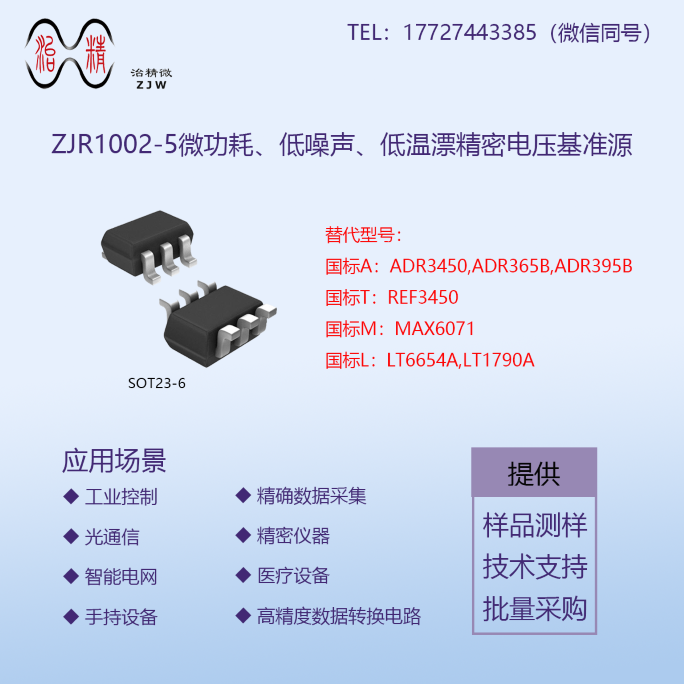 ZJR1002-5与国标A:ADR3450、ADR365B、ADR395B;国标T:REF3450;国标M:MAX6071;国标L:LT6654A、LT1790A兼容。这非常适合于诸如精密仪器和测试设备等所需的高分辨率(14位以上)数据采集应用。它们在-40℃至125℃的宽温度范围内保证性能,可以满足工业及汽车等应用的要求。